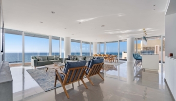 Cet appartement de plain-pied offre une surface habitable de plus de 208 mètres carrés, complétée par 72 mètres carrés de terrasses en teck qui entourent l'appartement et offrent une vue imprenable sur la Méditerranée et la ville depuis chacune des pièces principales.
