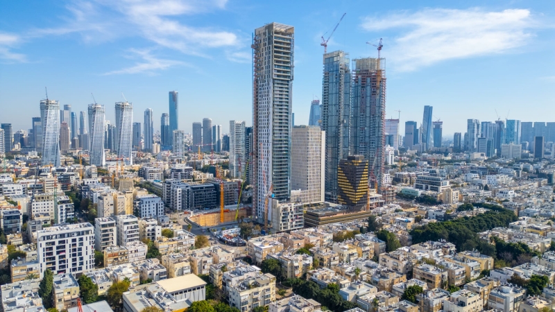 Appartement élégant à un étage élevé avec vue panoramique sur la ville et la mer dans une tour de luxe à Tel Aviv.